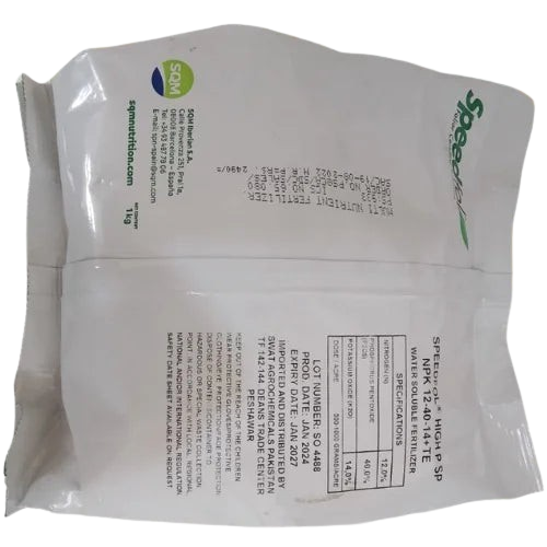 SpeedFol High P Sp NPK 12-40-14 + TE 1kg Soluble Fertilizer is a premium foliar plant nutrition solution specifically designed to optimize plant health and productivity. This specialized product, developed by Swat Agro Chemicals, is packed with a balanced nutrient profile ideal for crops requiring a higher phosphorus (P) input.